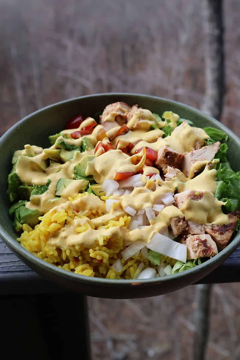 Yes! Each bowl packs about 45 grams of protein thanks to the grilled chicken and Greek yogurt in the sauce. It's high in protein, has plenty of fresh veggies, and you can easily adjust the rice portion to fit your macro goals. No heavy cream, no mayo - just clean ingredients.