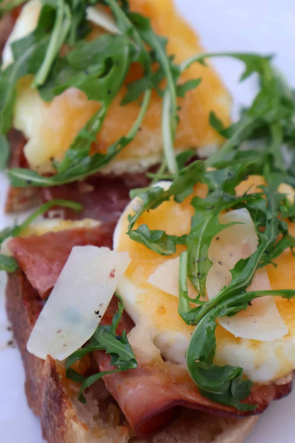 - Layer the browned ham on the sourdough, followed by both fried eggs. Pile the shredded cheese on top of the eggs.