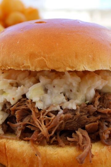 This pulled pork sandwich is the ultimate game day crowd-pleaser - fall-apart tender pork in a tangy homemade vinegar BBQ sauce, piled on brioche buns. Make it ahead and let everyone serve themselves.