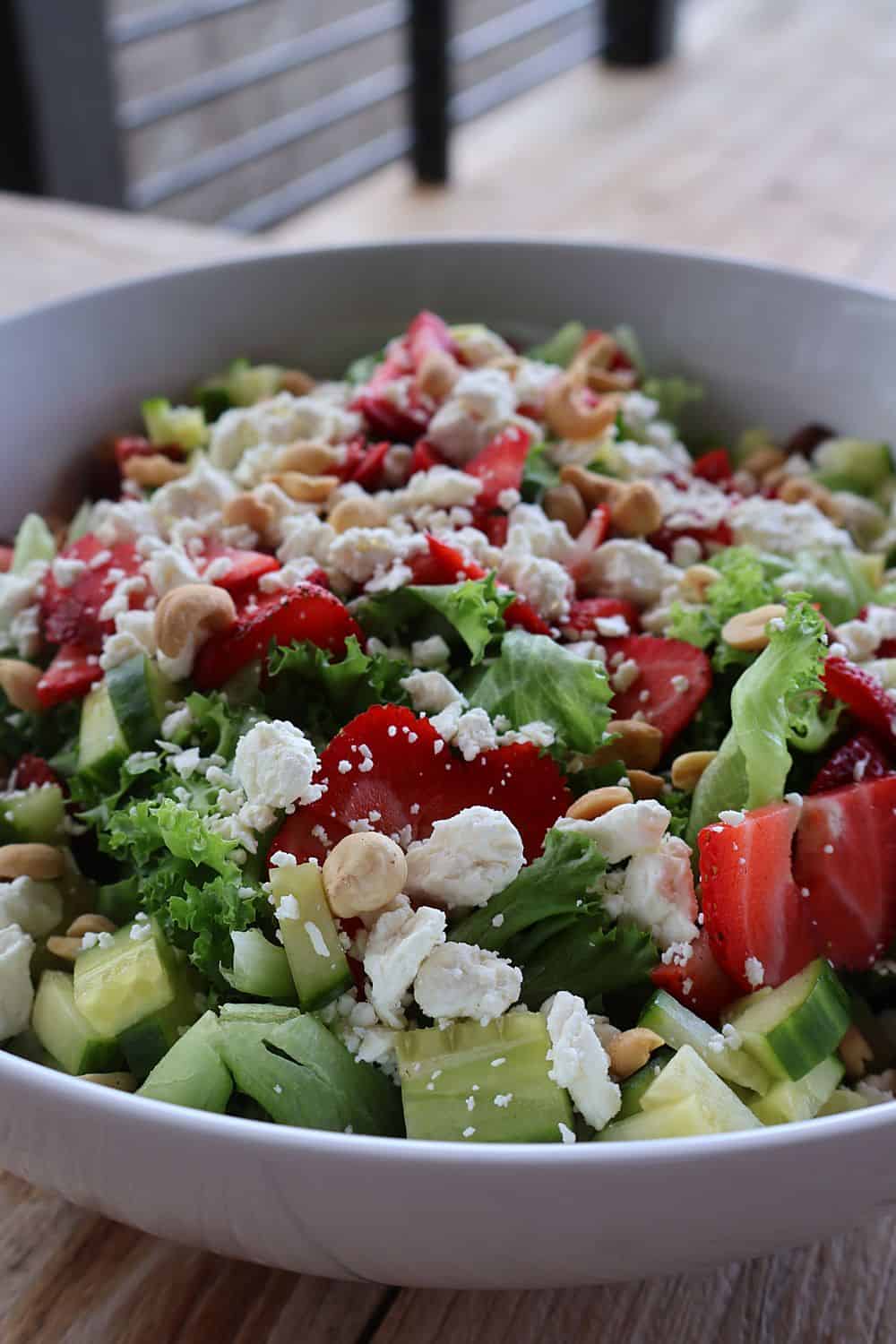 Fresh strawberry salad with gorgonzola, cucumber, toasted almonds, and homemade strawberry balsamic dressing. Ready in just 10 minutes!